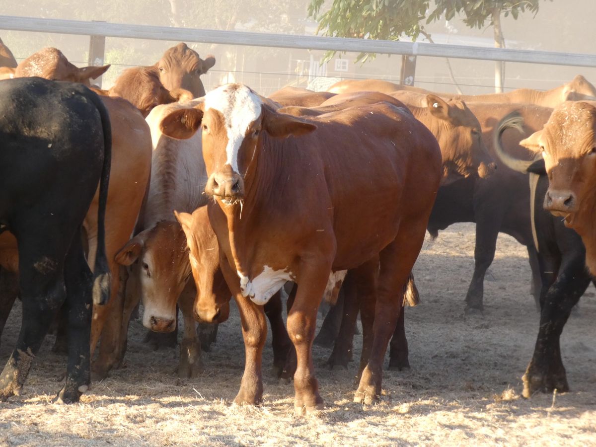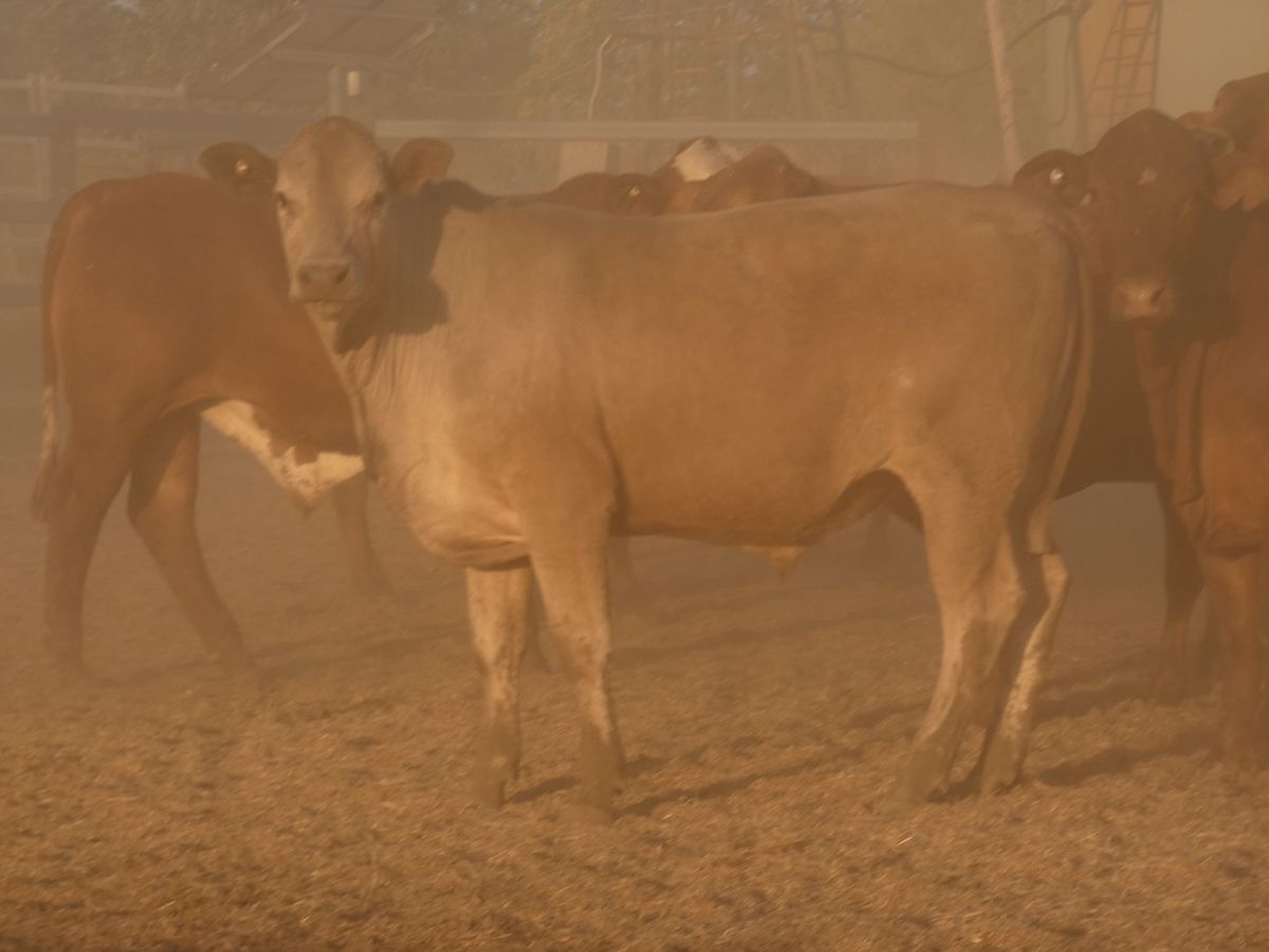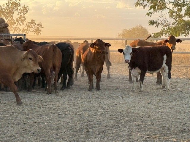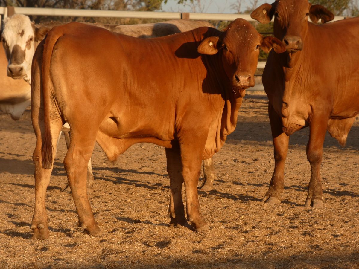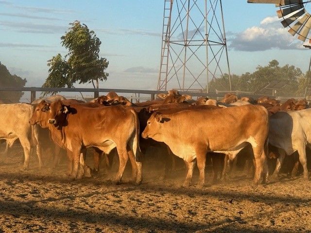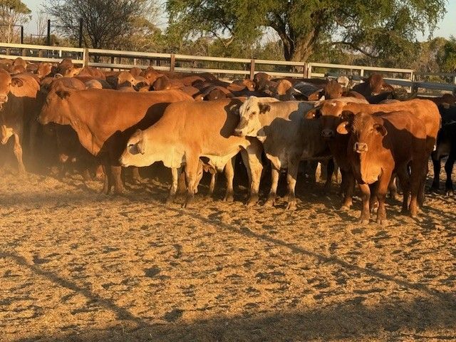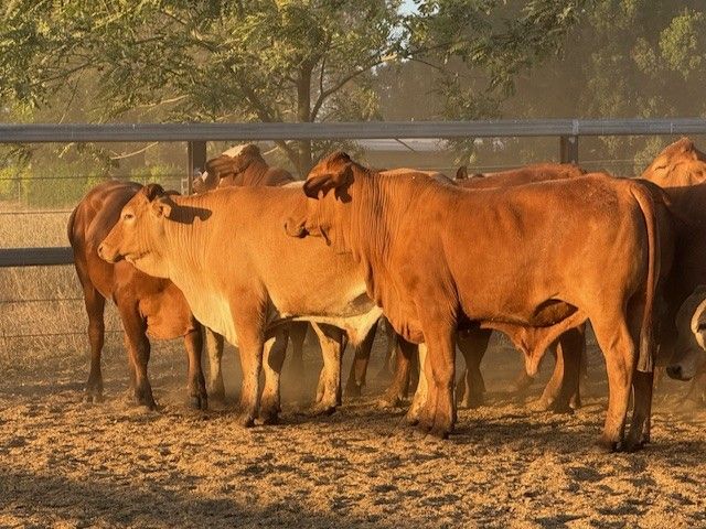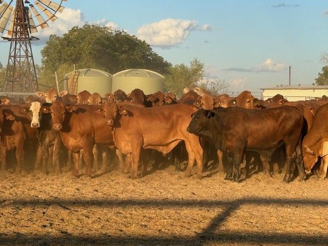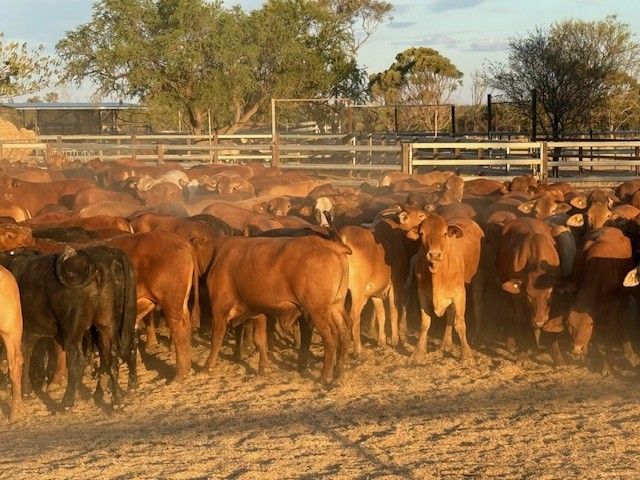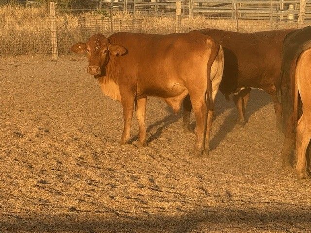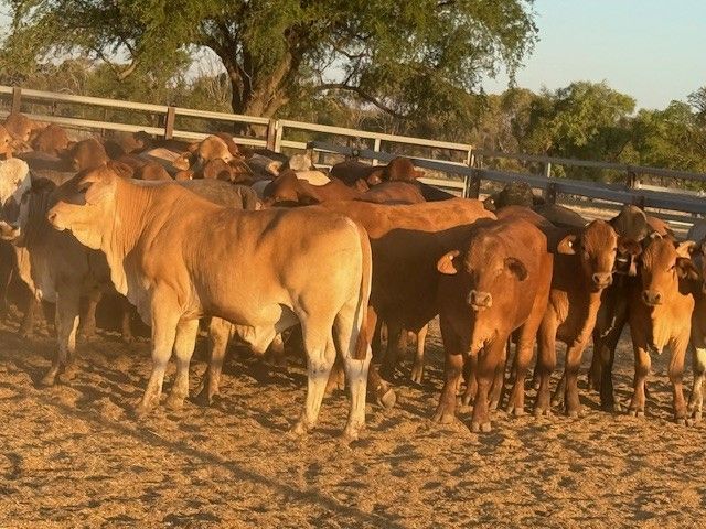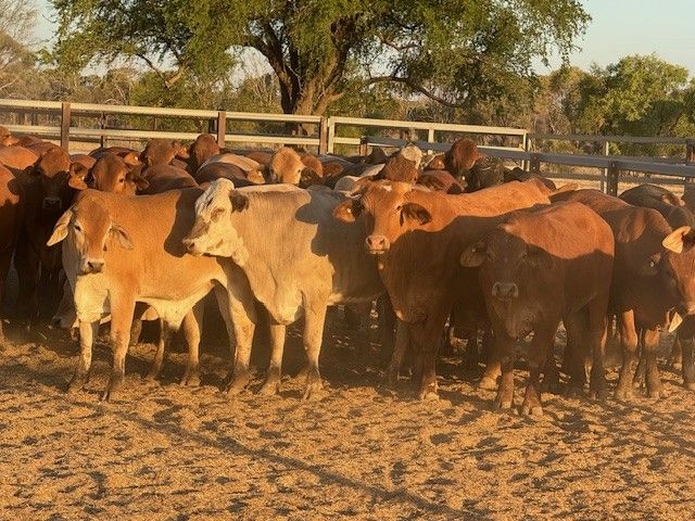 156 Good Quality HGP FREE DroughtmasterX feeder steers. At assessment after being in the yards overnight on water and off feed, the steers weighed from 351-494kg to ave. 420kg. The steers are medium and large framed and will grow into ideal grainfed bullocks. They are in store condition and HGP Free! Of steers mouthed 59% Milk; 31% 2tooth and 10% 4tooth. The odd BrahmanX steer has minimal hump with majority being flat back. Ideal steers to put onto grain or into grass to grow out to Bullock. Cattle located in tick area, vendor will guarantee cattle clear dip and pay for associated dipping costs.